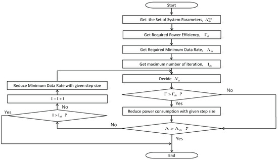 Example of operation flow chart is presented in Figure 4. First, BS can get system parameters, then it gets required power efficiency. Based on system parameters and power efficiency, the required minimum data rate can be derived. The can be derived using the proposed closed-form equation. The RS can be designed and used based on . Then, communications between massive MIMO and distributed IoT devices would be conducted. If power consumption is higher than the threshold, we can reduce power consumption by any kind of parameter adjustment. Typically, TX power consumes a lot of power, thus it can be reduced to increase power efficiency. However, TX power reduction accompanies data rate reduction. If the data rate is higher than threshold even though TX power is reduced, then system is in good shape and the procedure can be finished, but if data rate is lower than the threshold due to the TX power reduction, then in a given number of iterations, we should reduce required minimum data rate to satisfy power efficiency. The determination of thresholds for the number of iterations, power consumptions, data rate are the system designer’s choice. For the better understand and implementation, we provide the detailed algorithm as pseudo-code type in Algorithm 1.