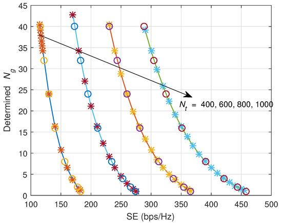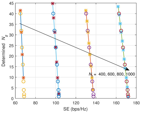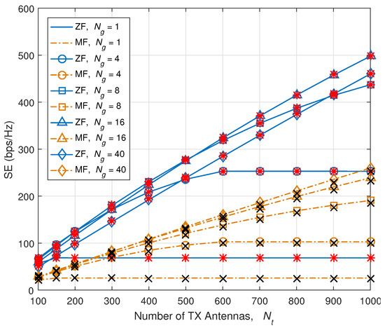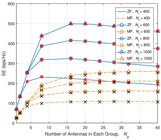 SE versus number of antennas in each group, . Red ‘*’s and black ‘x’ indicate the simulation results.