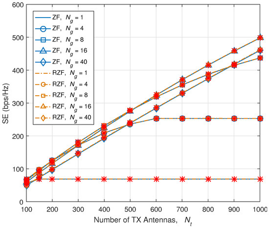 As we mentioned in the previous section, for the case of RZF precoding, we can use the case of ZF precoding. Figure 10 presents the SE comparison of ZF precoding and RZF precoding. We use which is the downlink RX inverse SNR matrix [28,30,40]. As observed, the SE of RZF precoding also exactly matches with the analytical SE of ZF precoding. Thus, all the analysis for ZF precoding in this paper is also applicable to RZF.