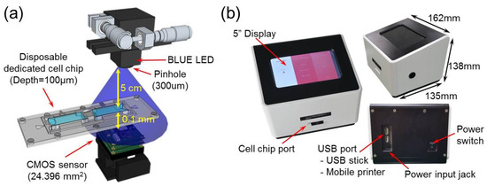 Figure 1. Lens-free cell analyzer, NaviCell. (a) The optical part consists of a blue LED, a 300 μm pinhole for coherent illumination to a sample chip and a CMOS image sensor for acquiring images from the sample; (b) For convenient usability, a 5-in. touch display is mounted at the top of the device, which allows for the reporting of quantitative results and for viewing images of the samples without additional equipment. The NaviCell is operated by a proprietary program based on an Android system. Samples for analysis are prepared on a disposable chip which was developed to increase the shadow intensity of the cell.