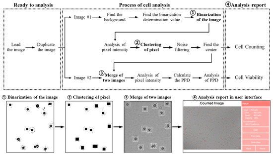 Figure 2. Concise workflow of the algorithm for the processing of the lens-free shadow image. The algorithm consists of binarized image, clustering, counting and viability analysis. Bottom pictures show how the original image is transformed at critical steps.