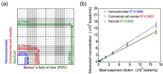 The FOV represents the size of the area that can be measured at one time and is an important indicator for determining the performance of the cell counter. Figure 3a compares the FOV of the three measurement methods used in this study. The blue box shows the FOV of the hemocytometer (1000× microscope), which is 1 mm × 1 mm. The red box shows the FOV of the commercial cell counter with a size of 2.15 mm × 1.62 mm. The green box shows the FOV of the NaviCell with a size of 5.7 mm × 4.28 mm. The NaviCell therefore has an FOV approximately seven times and 24 times wider than the commercial cell counter and the hemocytometer, respectively. As expected, it is possible for the NaviCell to obtain the widest range of FOV because no optical lenses are installed.