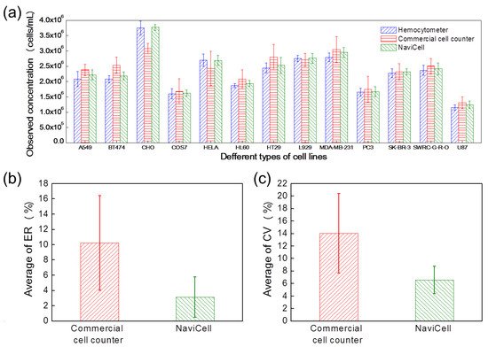 To compare the counting performance, the ER (Figure 4b) and CV (Figure 4c) were calculated for the measured 13 cell lines. The ER and CV were calculated using Equations (2) and (3), respectively.