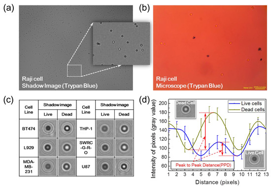 The suggested cell counter in this study enables the analysis of cell viability without pretreatment of cells. The NaviCell can analyze the contrast of the shadow image of a cell to distinguish the live and dead states. Figure 5a,b shows matching images taken with the NaviCell and the microscope. The Raji cell line was used for the experiment and was stained with trypan blue only for the conventional method. As can be seen in the matched images, the contrast of the shadow image of the dead cells (stained cells) increased up to 354% compared to living cells (unstained cells). To obtain the matched shadow image with the microscope (Figure 5a), this shadow image was also taken after staining.