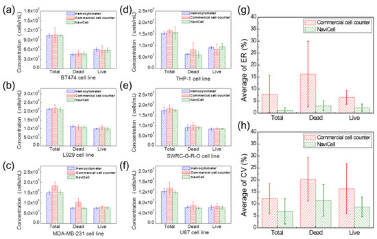Figure 6. Comparison of cell viability performance using six cell lines. (af) Concentrations of BT474, L929, MDA-MB-231, THP-1, SWRC-G-R-O and U87 cell lines, respectively, by dividing into total number of cells, number of dead cells and number of live cells; (g) Average ER of the total cell count, dead cell count and live cell count; (h) Average CV of the total cell count, dead cell count and live cell count.