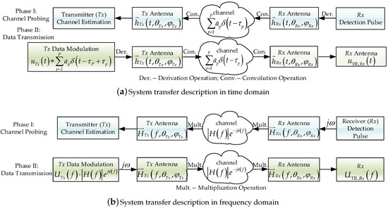 Systemtransfer schemes of time reversal based ultra-wideband (TRUWB) communication system, (a) in time domain; (b) in frequency domain.