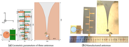 The three typical kinds of planar antennas that are used to measure the channel responses of TR UWB sensors system are displayed in Figure 2. Figure 2a shows the geometric parameters of each antenna, the numerical unit is millimeters (mm), and from left to right are monopole, log-periodic and Vivaldi antenna, respectively. The selected reference axis system is also presented, the angle starts from the positive z-axis and the angle starts from the positive x-axis as usual. The orange structure on the front side of the monopole is the metal radiation patch and the olive structure on the backside is the metal ground. The metal orange structure on the front side and the metal olive structure on the backside of the log-periodic antenna are totally symmetrical. The light orange color on the front side of the Vivaldi antenna is the radiating structure with tapered slot and the dark yellow structure on the backside is the feed balun. The slot curve of the Vivaldi antenna is exponential function, which is expressed as . The light gray parts are substrate plates and the thickness of three substrate plates are all 1 mm. The permittivities of the monopole, log-periodic and Vivaldi antenna are 4.4, 2.65 and 3.5, respectively. The manufactured antennas are shown in Figure 2b, the sizes of the monopole, log-periodic and the Vivaldi antenna are 58 mm mm, 70 mm mm and 126 mm mm, respectively. It can be seen that the effective area of the Vivaldi antenna is the largest.