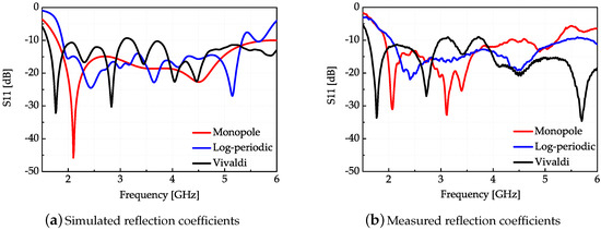 Simulated and measured reflection coefficients of three antennas.