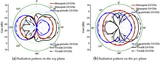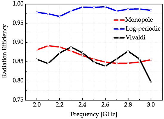 The simulated and measured S-parameters of each antenna are correspondingly shown in Figure 3. It can be seen that the simulated and measured curves are matched well under 6 GHz. In this experiment, the frequency bandwidth selected is the common working bandwidth of three antennas from 2 GHz to 3 GHz. Figure 4 displays the radiation efficiency of each antenna. The radiation efficiency of the log-periodic antenna in the measurement bandwidth is the highest. Figure 5a presents the radiation patterns of the three antennas on the xoy plane and Figure 5b are the radiation patterns on the yoz plane (the axis system has been shown in Figure 2a), respectively. The radiation pattern of the monopole on the yoz plane is nearly omnidirectional, while the log-periodic and Vivaldi antenna are directive. The maximum gain and 3 dB beamwidth of these three antennas at frequencies 2 GHz and 3 GHz have been displayed in Table 1. It can be seen that the gain of the monopole is minimum and the gains of log-periodic and Vivaldi antenna are nearly equal. The 3 dB beamwidth of the log-periodic antenna is larger than the Vivaldi antenna on the yoz plane.
