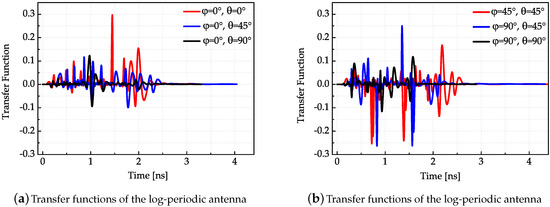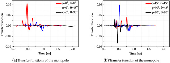The results shown in Figure 7, Figure 8 and Figure 9 conform to the result in Figure 6. The simulated antenna dispersion properties presented in Figure 6 are in the main lobe direction, and the results in Figure 7, Figure 8 and Figure 9 also demonstrate the difference of antenna transfer functions in different directions, such as signal intensity and antenna dispersion. The amplitudes of the transfer functions corresponding to the same antenna in different directions indicated the directive transmission properties.