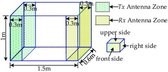 All of the measurements are performed in a metal cavity shown in Figure 11. In Figure 11, the left shaded zone of the cavity is where the Tx antenna is located and the shaded zone at the right is the location of the Rx antenna. The dimension of the cavity is 1.5 m × 0.6 m × 1 m. The Tx and Rx antennas are independently and randomly placed on the respective location areas. The backward side i.e., the ground of these antennas is attached to the center of a 30 cm × 30 cm foam base with a thickness of 6 cm, and then the foam base is adhered to the metal wall. Firstly, each Tx or Rx area is divided into uniform grids that have the same areas as the foam with serial numbers. In addition, then the Tx or Rx is independently placed on the numbered grid according to the pre-generated random number with equal probability. The orientation of the Tx and Rx antennas are also independently random. No matter which side the antenna is placed on, the positive direction of the y-axis (in Figure 2) has four choices and each with probability 1/4. When the antenna is on the front or backward side, the direction of the positive y-axis can either be along the upper, lower, left or right side. In the same way, once the antenna is placed on the left or right side, the positive y-axis can be along the upper, lower, front or back side. Lastly, the direction of the positive y-axis can be along the front, back, left or right side when the antenna is placed on the underside. The measured times of each position will be five and the measured position of each pair of antennas is one hundred.