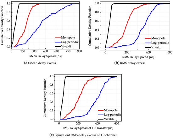 The results in Figure 14 show that the Vivaldi antenna has both the minimum mean delay spread and RMS delay spread. This is intuitive because of its largest channel gain. For the setting of the given threshold value, multiple paths of the Vivaldi antenna with extremely lower amplitudes are regarded as noise thus being filtered out. Similarly, the channel gain of the log-periodic antenna pair is relatively the smallest; thus, more multipath components are detected above a given threshold with larger path delay. Because of the temporal focusing effect of TR transmission, most of the energy is focused on the path with maximal transmission gain, the cumulative density functions of the mean excess delay corresponding to equivalent TR transmission are highly concentrated, but the RMS behaves differently by observing Figure 14c. Because of its overall highest transmission gain, the Vivaldi antenna has the smallest RMS delay spread in the TR transmission while the log-periodic antenna correspondingly has the largest RMS delay spread. The reason is the same as in the unidirectional transmission.