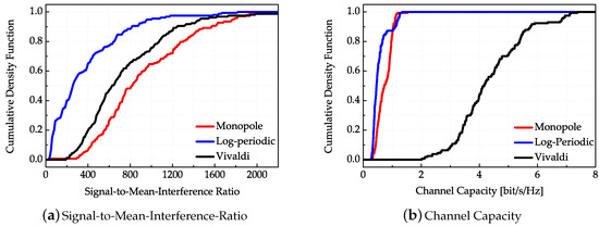 The cumulative density functions of the SMIR are exemplified in Figure 15a. The results show that the monopole antenna has the best SMIR performance while the log-periodic antenna has the worst SMIR performance. In other words, the monopole antenna has the best energy focusing ability and anti-interference performance while the log-periodic antenna possesses the worst energy focusing ability. Although the channel gains of the Vivaldi antenna are all relatively the largest, while the gains of the log-periodic antenna are the smallest, they have smaller ratios between the main path power and the average interference path power than the monopole antenna. The SMIR performances are in accordance with the antenna dispersion properties, which means that the smaller antenna dispersion can obtain better energy focusing property and anti-interference property. The cumulative density functions of evaluated channel capacities corresponding to each TR transmission are demonstrated in Figure 15b. Using the classical Shannon capacity formula, the measured time domain channel response is firstly turned into the frequency domain, and then the frequency band is divided into 1024 sub-bands, where each sub-channel can be considered as frequency-flat, and then integrate the channel capacity for the sub-bands over the whole bandwidth [23]. Through the total derivation procedure of the TR UWB system, the channel capacity of the TR system is given by