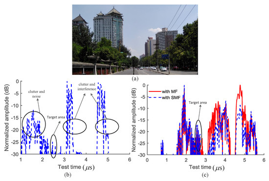 The test echo signal in the typical urban environment. (a) A picture of the typical urban environment; (b) the raw echo signal; and (c) The echo signal with the matched filter MF and the self-adaption matched filter (SMF).