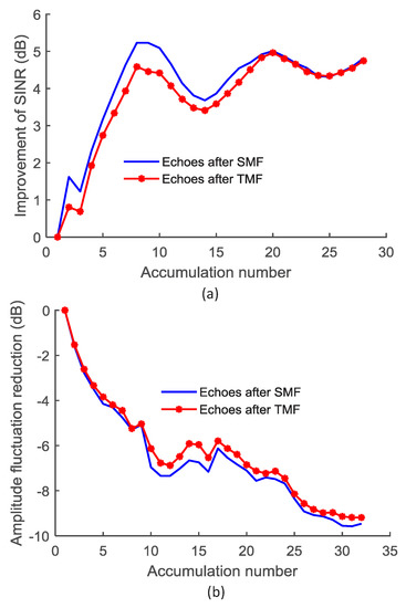 The SINR improvement is limited by the accumulation time using the ACA method for the moving target since the time positions of the amplitude peaks from different tests vary. The time delay intervals between the peaks depend on the velocity of the target. It can be seen from Figure 2a that the amplitudes of the target echoes are cumulative when the time delay interval is less than a limited time interval, that is, the accumulation gain increases with the increase of the accumulation number when the accumulation number is less than 8, which provides a reference value of coherent detection times in the target detection process. The result shown in Figure 2 is the average result of the data from 32 MonteCarlo experiments. The fluctuation of the SINR improvement is less than 0.9 dB. From the amplitude accumulation experiments we can see that an accumulation number of 8 provide the best improvement. The amplitude fluctuation of the noise/interference can be effectively reduced with the increase of the accumulation number as shown in Figure 2b. The fluctuation of the amplitude fluctuation reduction is less than 0.8 dB.