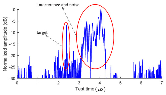 where is the echo signal from the target (or the background) with the time delay of ; and are the amplitude and the phase shift for the echo with the time delay of , respectively; i is the index of the target echo; and is the summation of the noise and the interference. The echo signal in an urban environment contains echoes from the background, the noise, and the interference. The power of the interference and the noise is significantly larger than that of the target echoes, as shown in Figure 1. The figure illustrates a scenario containing typical environmental characteristics during the detection. The background and the interference are still greater than 20 dB over the target echo after the MF processing and removing the background and the coherent interference. In order to be detectable, the target should be away from the strong interference.