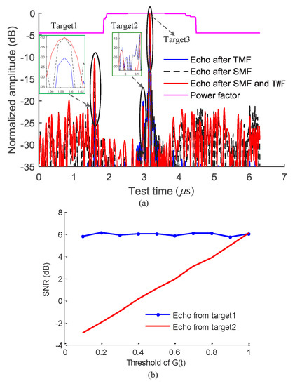 Three simulated target echoes, with power ratios 1:1:100, are concluded in the Figure 4a. The threshold of the power factor is 0.6 in order to make the SNR of the echo from the target 2 positive according to the result shown in Figure 4b. The figure shows that the power of the small echo of target 1 (target 1 is away from the high-power echo area) can be improved using the SMF method. However, the SNR around the target echo cannot be improved as shown in Figure 4b. The performance of the SMF for the small target echo close to the high-power echo is similar to the performance of TMF, however, the SNR of the echo from the small target close to the strong echo is determined by the threshold of the power factor G(t). The time window function (TWF) can reduce the time side lobe of the target echoes [17]. Hence, the small target echo close to the high-power echo can be distinguished more easily when the TWF is used, as shown in Figure 4a.