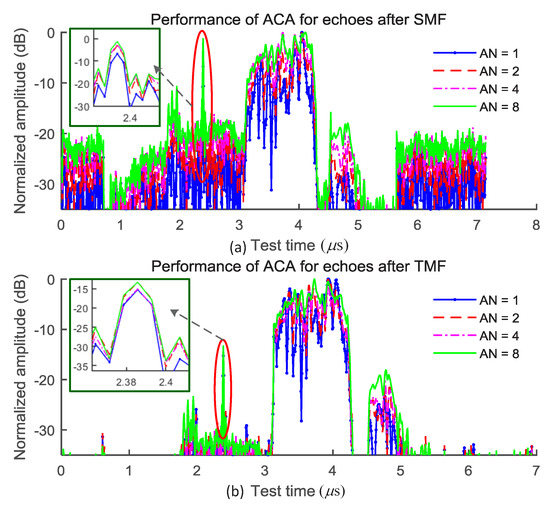 Performance comparison of the ACA method under different accumulation numbers. (a) The performance of the ACA based on the echoes filtered by SMF; (b) The performance of the ACA based on the echoes filtered by TMF.