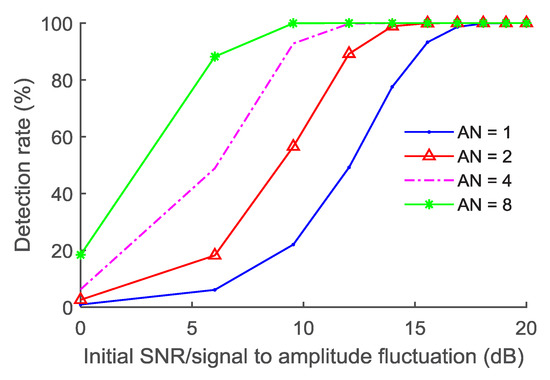 Figure 6 shows the performance of the BDD technique corresponding to different accumulation numbers under different SNR (or amplitude fluctuations of the interference). The ACA method is ineffective when AN = 1. The SNR and the signal to amplitude fluctuation ratio are equivalent since the noise and the amplitude fluctuation approximately belong to the same distribution. It can be seen from the figure that the SNR should be higher than 16 dB in order to ensure the high performance of the BDD method using a single test.