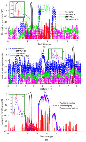 The amplitude of the target echoes after the SMF and the ACA processing may not be evaluated directly, although, the SINR can be improved significantly as shown in Figure 3. The data shown in Figure 3 is one snapshot in the data set used in the analysis for Figure 2. Nevertheless, the features of the target echoes after processed by either the SMF or ACA method become obvious. The target can be distinguished according to the following two factors: First, the SNR in the range around the target echo is good due to the proposed SMF and ACA method. Second, the fluctuation characteristics of the target echo and the nose/interference are different. The fluctuation feature of the target echo can be enhanced further using the time window function. According to the above two aspects, the BDD technique is proposed as: