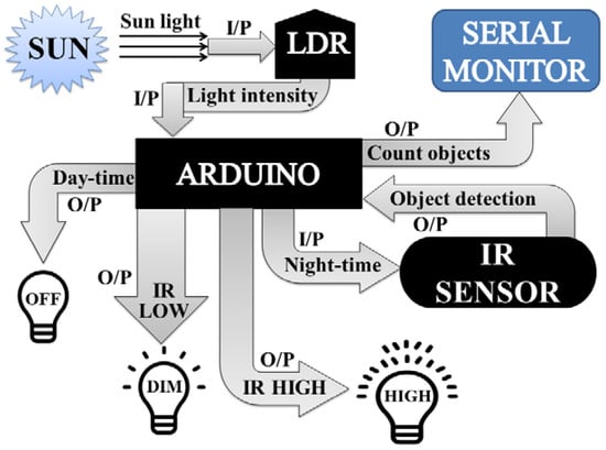 For the simplicity of discussion, Figure 1 illustrates the overall working mechanism and the features of the proposed lighting concept. I/P and O/P represents the input and output, respectively. LDR first senses the intensity value of sunlight and sends it to Arduino. After receiving the data, Arduino converts it into different discrete values from 0–1023, and judges whether the received value is above the threshold level (a limit value that is set independently by the user from the range of discrete values: 0–1023); it will then be considered as day-time, and the LEDs will remain OFF; if the received value is below the threshold level, Arduino will consider it as night-time. During night-time, if the value of IR obstacle avoidance sensor is LOW and detects no object, then DIM LEDs will glow, or if the IR obstacle avoidance value is HIGH and identifies any object, then HIGH LEDs will shine. Arduino also counts the total number of objects that cross the street in the night, with the help of IR obstacle avoidance sensor, and demonstrates this to the serial monitor.