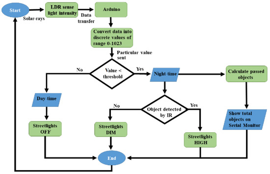 In the beginning, the LDR sensor will sense the light intensity in the atmosphere at that time, and it will consequently transfer the data to Arduino, as can be seen in Figure 3. After receiving the data, Arduino will convert it into different discrete values from 0 to 1023 (in which 0 represents maximum darkness, and 1023 represents maximum brightness), and then it will adjust the output voltage accordingly from 0 to 2.5 V/5 V (DIM/HIGH) depending upon the received value (0–1023) by comparing it with the threshold value. Whereas, the threshold value can be randomly chosen by the user and in this case, the threshold value is adjusted to 10. So, the output will be 2.5 V in the complete darkness (night time), if the received value is less than the threshold value. As a result, DIM LEDs will glow that is the half of maximum brightness, and when there is completely shine (daytime), the received value will be higher than the threshold value, and the output voltage would be 0 V, resulting the LEDs to be completely switched OFF.