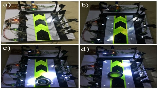 Figure 4 shows the final demonstration of the proposed automatic streetlights system that turned to DIM at night-time and HIGH on vehicle movement using Arduino Uno. Figure 4a represents day-time, with no LEDs glowing after measuring the sensed intensity value of sunlight with the threshold value (10) by the LDR sensor. Figure 4b shows the night-time because the sensed intensity value of sunlight by LDR was below than the threshold value (10) and there was no motion detected by any of IR obstacle avoidance sensors, so as a result, the DIM LEDs were glowing. The beauty of the proposed model can be seen in Figure 4c,d, with the motive that only those LEDs that detect the object’s presence will glow brighter, and the remaining LEDs will keep maintaining their DIM state. As an example, in Figure 4c, the first set of LEDs are glowing HIGH, and remaining are in DIM mode because the sensed intensity value of sunlight by LDR is below then the threshold value, so it considered it to be night-time, and there was an object that was detected by the first IR obstacle avoidance sensor. Moreover, when the object moved to the second IR obstacle avoidance sensor, the second set of HIGH LEDs were glowing, and the first set again reverted to the DIM state (Figure 4d). These results demonstrate the efficiency of the proposed idea and give immediate validation for the proposed model. These kinds of application can be implemented in the headlights of objects, street lights, the parking lights of hotels, and in malls and homes.