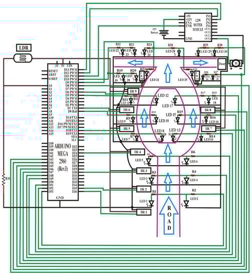 Figure 5 shows the circuit design of an automatic streetlight control system without DIM lights capability based on object detection using Arduino Mega [56]. In this design, an LDR sensor, 30 LEDs, 31 resistors, 11 IR obstacle avoidance sensors, a DC motor, an L298 motor module, and a single Arduino Mega were used. Hence, one leg of the LDR sensor was connected to the Arduino analog pin number A0, and another leg to a 5 V pin, and the same with a resistor to the GND port of Arduino. The threshold value was adjusted to 10 from discrete values (0–1023) for understanding whether it is day or night. All of the positive terminals of the LEDs set were connected, along with resistors to the pin number D53–D51, D19, D0, D5, D49–D47, D9, D10, and D46. In this regard, one set of LEDs consisted of two individual LEDs or more. Also, the GNDs of all the LEDs were connected to the GND port.