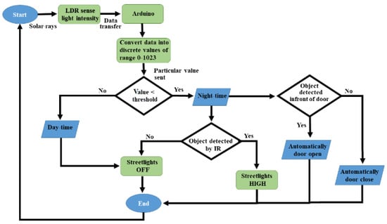 Automation systems [1,2] have the advantage over the manual systems because it increases the productivity, efficiency and reliability, and minimizes the usage of resources to save energy, and reduce the operating cost etc. These automation systems play an essential role in the term “smart home” [3,4,5,6,7,8,9] to make our daily life more comfortable, and to facilitate users from ceiling fans to ovens, and in other applications. Among all exciting applications, streetlights play a vital role in our environment and also play a critical role in providing light for safety during night-time travel. In this scenario, when the streetlights are in a working position over the whole night, which consumes much energy and reduce the lifetime of the electrical appliances such as a light-emitting diode (LED) lamp, incandescent light bulb, gas discharge lamp, and high-intensity discharge lamps. Especially in cities’ streetlights, it is a severe power consuming factor and also the most significant energy expenses for a city. In this regard, an automation system is required to control the lights according to needs.