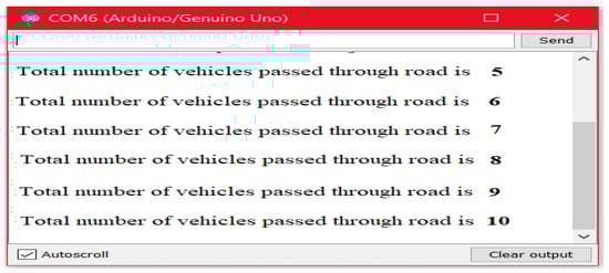 It is worth noting that the objects passing through the road often contain a large number of quantities that become more difficult to monitor at night-time. Thus, on the basis of monitoring objects to improve safety measurements, the serial monitor of Arduino IDE [12,13] is further adopted and considered as an interface to count and display the number of objects passing through the road at night-time. In this regard, when any object is detected by IR sensor (Figure 3), the Arduino will consider it as a vehicle movement and will demonstrate it on the serial monitor. Figure 8 illustrates the total number of objects on the serial monitor that passed through the road at night-time.