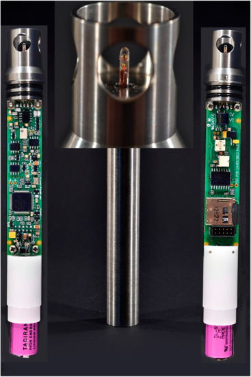 Initially, in version NIOZ1: 32, later in version NIOZ2: 128, T-sensors were connected via cables to a central data logger and power supply unit [14,15], respectively. After considerable connection and leakage problems, it was decided to construct stand-alone self-contained sensors: Version NIOZ3 [16]. The low noise level <0.1 mK and high precision <0.5 mK NIOZ3 sensors had τ = 0.25 s in water and standard sampled at a rate of 1 Hz (adjustable) for a duration of one year on one Lithium Li C-cell battery. However, their NTCs were slightly pressure affected since they were glued to the inner wall of the glass tube. The glass tube is not vacuumed and its air maintains a laboratory pressure (~1 bar). The slight pressure effect in NIOZ3 NTCs is assumed to be caused directly by the glass instead of through air compression. It is noted that the main titanium grade-5 housing is made nearly vacuum (~0.1 bar) inside in order to keep the electronics dry and to prevent the tube from separating the sensor head during overboard operations.