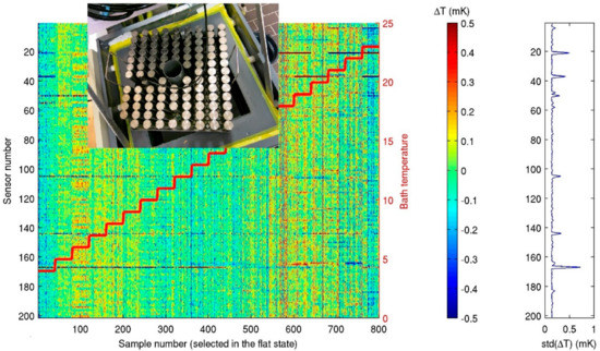A calibration with a precision <0.5 mK is achievable using a thermostatic bath with constant temperature levels to within ±10−4 °C of their preset values (Figure 2). Such precision was obtained in a 32 L bath with some glycerine added to range between [−5, 30] °C. Up to 210 T-sensors are put with their sensor head into a 0.03 m thick titanium plate that evens out all small-scale temperature variations in the bath. Up to two high-precision SeaBird-35 Deep Ocean Standards platinum Thermometers are also put into the titanium plate for reference. Each one-degree step takes 3 to 4 hours to reach 0.1 mK stability, which is an entire calibration requiring 4 to 5 days in the laboratory.