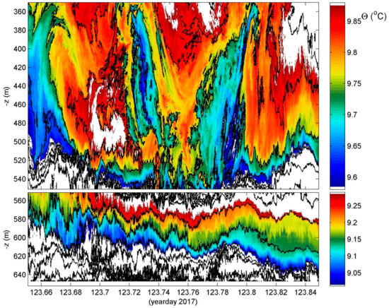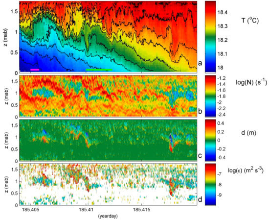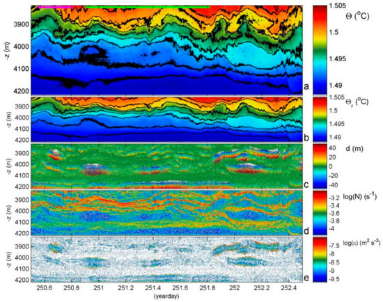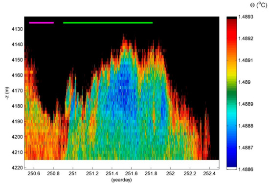 At this Southern Hemisphere site, the flow over the ~100 to 200 m high surrounding hills, the nearest is 2 km away from the mooring and may set the isotherms in motion [30,31]. Yet, the temperature range is only 0.015 °C and, in the lower 65 mab, is only 0.001 °C (Figure 5), which are both well below the adiabatic lapse rate. This pushes the post-processing to great limits. The turbulent overturning is very slow and may take a day. See between days 251.1 and 252.1, which is around −4180 m. This is not related with post-processing by forcing the four-day mean to a smooth statically stable profile. It is related to the physical process of a relatively sudden upward internal wave motion, which leaves behind and below it a very weakly stratified region of about 60 m (80 m maximum) thickness. The stratification is so weak that the local buoyancy period is equal to one day, which is indicated by the green horizontal bar. This is just larger than the observed duration of the instability. Generally, turbulent overturns have the duration of up to the mean buoyancy period with thicknesses up to 100 m in the abyss (Figure 4c).