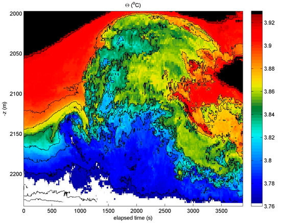 More intense by a factor of 10–100 is the turbulence observed over a 2250 m deep sub-ridge of the large Mid-Atlantic Ridge underwater mountain chain system using the same T-sensor array set-up of 200 sensors @2.0 m. The turbulence includes backwards breaking waves (Figure 6) that mimic sketched surface wave breaking [32]. The turbulence extends more than 200 m above the bottom [33] and its intensity is, thus, high since no trace is found of the Rainbow thermal vent system, which is only 3 km away from the mooring. These T-sensor data confirmed historic observations [34,35] that the vent is not traceable in temperature at distances >1 km away horizontally. It also confirmed the importance of turbulent mixing in canyons of underwater mountainous areas [36].