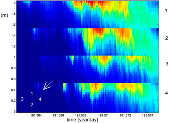 Seventeen minutes and 0.5 m depth range of slow propagation of internal wave turbulence past four mooring poles 4 m apart near Texel North Sea beach. The rippled waves came in from the NW, as indicated by the arrow. The depth range of the four poles are indicated cumulatively. The temperature range is [19.4, 19.9] °C between dark-blue and red, respectively.
