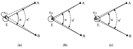 The main objective of the proposed testing procedure is to assess the uncertainty in the centring of an instrument. By instrument, we mean any geodetic or surveying equipment which needs to be set up exactly over a ground mark, usually with the assistance of optical or laser plummets associated to tribrachs. Therefore, theodolites, total stations, GNSS receivers or TLS could be considered. As presented in Section 1, the general criteria of standard ISO 17123 imply not requiring the use of special ancillary equipment. The great influence of the centring error in the horizontal angle measurement has been demonstrated. A testing procedure based on both considerations is proposed. The foundation of the method lies in the setting up of two stable targets at short distances from the instrument so that a small displacement in its position (due to the centring error) leads to a significant variation of the horizontal angle between both targets. A similar strategy can be found in [7], in this case to check the influence of the imperfection of construction of the tribrach. That approach is exactly the opposite of the configuration of the test field in standard ISO 17123-3, which locates the targets 100–250 m away to minimise the influence of the centring error. Figure 1 illustrates a horizontal angle α measured from Station E to Targets A and B. An error in the instrument centring does not affect angle α when the instrument is located in the position shown in Figure 1a, that is on the circumference containing E, A, and B (α ≅ α’). In contrast, the effect is maximum when the instrument is positioned along the angle bisector (Figure 1b,c) (α ≠ α’) [3].