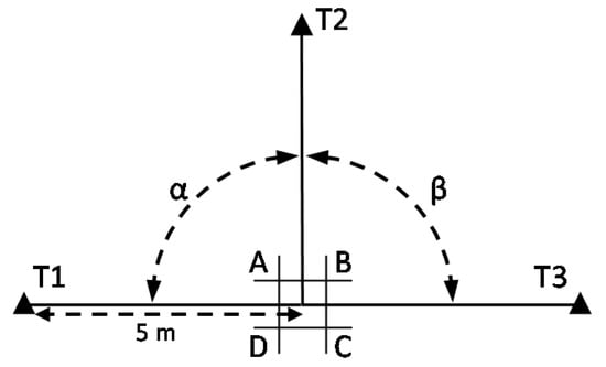 Design of the test field for the preliminary test (ground mark not to scale). Angle α is measured from Positions A and C. Angle β is measured from Positions B and D.