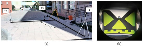 The proposed testing methodology described in Section 2 was applied with two different instruments: a Leica TS-06 total station (TS1), with = 15cc (≈ 5′′) (manufacturer specifications) and laser plummet and a Leica TC-1800 total station (TS2), with = 3cc (≈ 1′′) (manufacturer specifications) and optical plummet in tribrach. In both cases, these remain the same: operator, tripod, target plates (Figure 4b), and configuration of the test field (Figure 5).