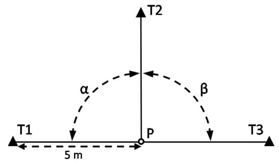 An instrument, ground mark, and operator should be chosen for the test. The test area is that which surrounds the ground mark at position P. Three fixed targets (T1–T3) shall be set up located approximately on the same horizontal plane as the instrument, 5 m away, and situated forming two adjacent right angles (α and β) (see Figure 5). Targets shall be used which can be observed unmistakably, preferably target plates. They shall be stable during the test measurements. The conditions of distance to the targets and right angles can be approximated; accurate conditions are not required.