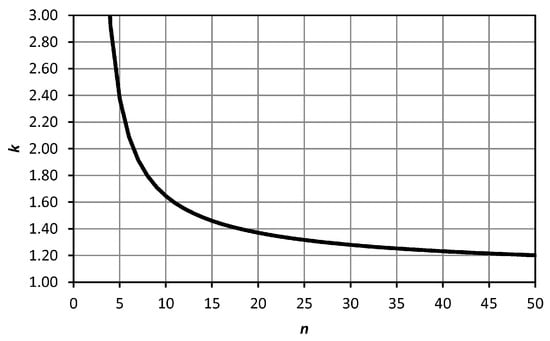 The sample size n is a major issue. In the full test procedure, it should be small enough to speed up the operation and large enough to obtain significant results. The confidence interval for the standard deviation can be considered. If the data are normally distributed, the expression has a chi-square distribution with degrees of freedom, where σ is the population standard deviation and s the sample standard deviation. Taking the upper limit of the confidence interval and a 5% level of significance for a one-tailed test, Figure 6 shows how many times (k) this limit is greater than s for each sample size n.