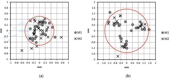 (a) Centring errors from setups performed with TS1 (laser plummet); and (b) centring errors from setups performed with TS2 (optical plummet). M1 and M2 are the ground marks in Figure 7.