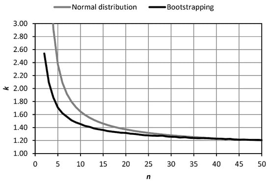 Additionally, a bootstrapping procedure [36] was developed for the centring error of TS1. All computations were performed using programs written in the R language [29]. Sampling sizes from 2 to 50 were chosen. For each sampling size, 10,000 samples were taken with replacement. For each sample, the standard deviation s was calculated. Finally, the quantile of 95% of the 10,000 standard deviation was obtained for each sample size. The objective was to compare the results with the upper limit of the confidence interval for the standard deviation (5% level of significance for a one-tailed test) presented in Figure 6 (which was based on the assumption of normality). Figure 9 shows how many times (k) this upper limit (grey line) and the quantile of 95% from bootstrapping (black line) are larger than s for each sample size n. It can be observed that k was lower in bootstrapping than in the normal distribution. This means that the experimental data from TS1 were better than expected from a normal distribution. This difference is more important for small sample sizes and tends to disappear when n increases. If we take the sample size suggested in Section 2.2 for the full test procedure, n = 24, the bootstrapping results indicate a value of k = 1.28, close to and lower than the value of k = 1.33 obtained from the normal distribution. Consequently, a smaller sample size could be considered for the full test procedure to reduce the fieldwork. The value of k = 1.33 was obtained from bootstrapping when n = 18.
