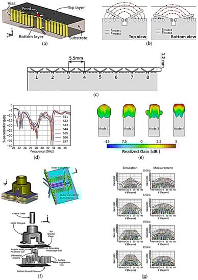 In [42], a planar quad-mode wideband phased array for a 5G mobile terminal device was reported. A phased-array design consists of eight antenna elements with eight MMPX (Micro-Miniature Connector) connectors. The proposed phased array is a multilayer design comprising two Taconic RF-30 substrate layers with thickness 0.762 mm, having a dielectric constant of 3 and loss tangent of 0.0014, vias, and microvias. Both layers were glued with FR4 glue having a thickness of 0.2 mm, and a dielectric constant of 4.3 and tangent loss of 0.025. The design overview of the proposed antenna is shown in Figure 6a. A coaxial-to-differential stripline transition feeding is proposed. The antenna is fed by a differential stripline feed. The top and bottom dipole antennas were connected to differential stripline through vias, as shown in Figure 6a. The proposed array antenna generates four distinctive modes when excited, as illustrated in Figure 6b, with an endfire radiation pattern in all modes. The measured reflection coefficients of the proposed eight-element phased-array antenna are presented in Figure 6d. The main beam-scanning range is from −90° to +90°. Figure 6g illustrates the scanning results of the proposed beam-steering phased-array antenna at 25, 27, 29, and 31 GHz. The final prototype of the phased-array antenna with connectors is shown in Figure 6i.