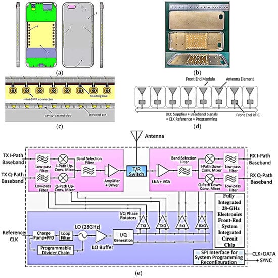 Yu et al. presented a study and design of a novel phased-array antenna operating at 28 GHz with beam-steering applications for a 5G mobile terminal with metallic casing in [41]. The proposed beam-steering array comprises two subarrays, each having eight identical elements on both sides of a mobile device with a metallic casing, as shown in Figure 13a. A slot element with a cavity-backed structure is proposed, which is easy to fabricate on the metallic casing of the mobile terminal. An important factor is to determine the optimum position of the proposed phased subarrays inside the mobile terminal before finalizing the actual design in practice. The length of the slot is kept at the half-guided wavelength λg/2, i.e., 5.8 mm at an operating frequency of 28 GHz, and the corresponding slot width is 1.5 mm with a cavity height of 4 mm. The high-gain directional radiation pattern of the slot element is achieved. Figure 13c illustrates the design of one of the proposed eight-element phased arrays. It is proposed to use small stepped pins soldered on the microstrip feed line feeding each element of the subarray. The microstrip feeding line is printed on a 0.254-mm-thick Rogers 5880 substrate having a dielectric constant of 2.2 and a loss tangent/of 0.0009. Each element has been provided by the phase variation using 6-bit phase shifters within a 28-GHz front-end RF integrated circuit (RFIC) chip to accomplish beam-steering, as illustrated in Figure 13e. Figure 13d shows the block diagram of the eight-element beam-steering phased array.