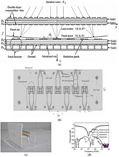 In [39], Jiang et al. proposed a novel array architecture for beamforming and multibeam massive MIMO systems using a metamaterial-based thin planar lens antenna. The proposed antenna comprises an EM lens combined with an antenna array. The EM lens together with an antenna array helps to increase the throughput and data rate of massive MIMO (m-MIMO). Both the lens and antenna elements were fabricated using PCB technology. Figure 17a,b respectively presents the side and top views of the proposed lens antenna. An array of a seven-element SIW-fed stacked patch antenna operating at 28 GHz is placed at the focal region behind the EM lens. Each subarray comprises four SIW-fed square patches as radiating patches. Each array element is connected to the input port using SIW-to-grounded-coplanar-waveguide (GCPW) transition feeding. The design overview of the seven-element SIW-fed stacked patch antenna array is given in Figure 17b. The proposed multilayer antenna array is fabricated on a Rogers RO4003C substrate having a dielectric constant of 3.55 and loss tangent of 0.0027. The thickness of the top and bottom layers is 0.508 mm and 0.813 mm, respectively. Both layers are joined together with a bonding layer of Rogers RO4450B, which has a dielectric constant of 3.54, loss tangent of 0.004, and height of 0.202 mm. A photograph of the fabricated prototype of the proposed seven-element array loaded with an EM lens is shown in Figure 17c. The measured 10-dB impedance matching ranges from 25.8–28.9 GHz, as shown in Figure 17d. The angular beam-scanning range of the proposed phased array is from −27° to +27°. Figure 17e shows the experimented radiation patterns of the proposed phased-array lens integrated antenna at 28 GHz. The measured peak gain of the lens-fed phased-array antenna is 24.2 dBi, with an efficiency of 24.5% at a frequency of 27.5 GHz.