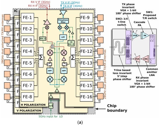- Dunworth, J.D. A 28GHz Bulk-CMOS dual-polarization phased-array transceiver with 24 channels for 5G user and base station equipment. In Proceedings of the IEEE International Solid-State Circuits Conference-(ISSCC), San Francisco, CA, USA, 11–15 February 2018; pp. 70–72. [Google Scholar]