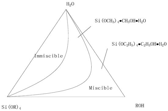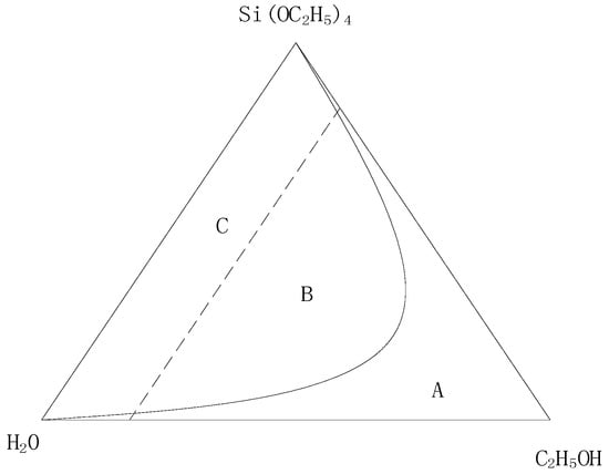 The sol-gel precursor solution was prepared using TEOS as the raw material. Because of the limited solubility of TEOS in water, a certain amount of co-solvent was needed. The co-solvent needed to be soluble with TEOS and water; as such, ethanol was chosen as the co-solvent. The ternary miscibility diagram of TEOS, C2H5OH, and H2O is shown in Figure 1. From Figure 1, it can be concluded that the addition of less ethanol would lead the ternary solution system to be immiscible, but the addition of more ethanol would immobilize the hydrolysis reaction of the system. In this paper, the molar ratio of ethanol to TEOS was 2:1.