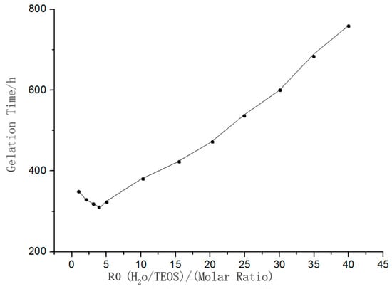 When the molar ratio (R0) of water to TEOS was less than 4, the gelation time decreased with increasing R0. TEOS could not be fully hydrolyzed while R0 was less than 4. As R0 increased, so did the concentration of Si–OH groups formed after hydrolysis of TEOS. At this time, the polycondensation reaction proceeded more quickly which decreased the gelation time. On the contrary, if R0 was more than 4, TEOS was be completely hydrolyzed and the concentration of Si–OH groups formed after hydrolysis of TEOS decreased with increasing R0. Hence, the reaction between Si–OH groups through collision was attenuated, resulting in an increased gelation time. Furthermore, as one of the polycondensation products, more water being added resulted in the polycondensation reaction being hindered. The relationship between the water–silica ratio and the system’s gelation time is shown in Figure 2.