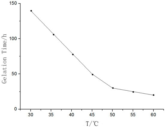 The relationship between the temperature and gelation time is shown in Figure 4, where it is shown that the gelation time decreased with an increase in temperature.