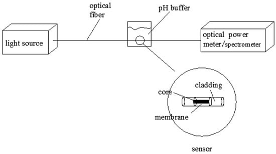 The pH value is a measurement of the hydrogen ion concentration in a solution. In environmental [1], industrial, pharmaceutical [2], and food industries [3], the pH value is a very important parameter. Currently, the pH glass electrode is widely used for the measurement of pH values [4], as it has the advantages of a wide measuring range and high accuracy [5]. However, the pH glass electrode has a short lifetime [6] and is susceptible to interference from electromagnetic wave and radio frequency; it is also easily contaminated or poisoned while being used in harsh environments (high temperature, high pressure, high corrosion, etc.), which leads to unstable or invalid measuring results [7]. Therefore, various research on non-glass pH sensors [8,9] is gradually becoming a hot spot. Optical pH sensors recently drew increased attention from researchers and users for its stable measurement signal, ease of transport, strong anti-electromagnetic-interference properties, pollution-free nature, and other advantages [10,11].